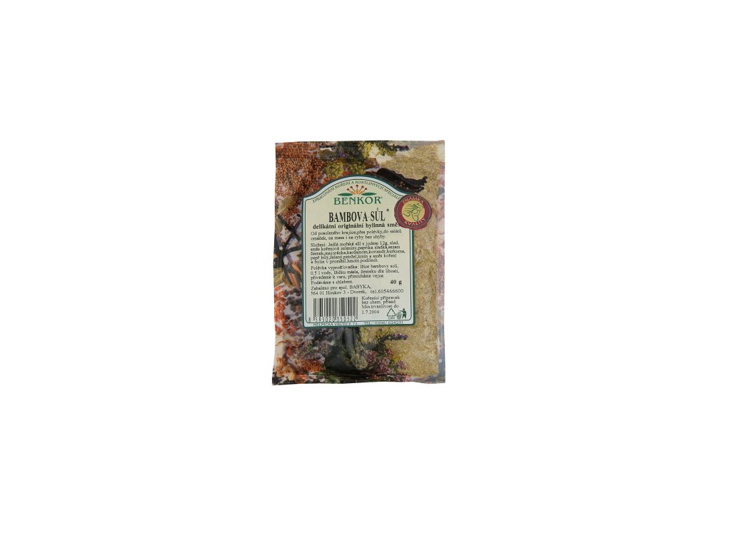 Složení: ječmen, sůl 32,8 %, sezam, česnek, karotka, petržel, celer, cibule, fenugreek, fenykl, hřebíček, chilli, kardamom, kmín, koriandr, kurkuma, majoránka, muškátový květ, nové koření, paprika sladká, pastinák, pepř bílý, pepř zelený, skořice, tymián, zázvor.