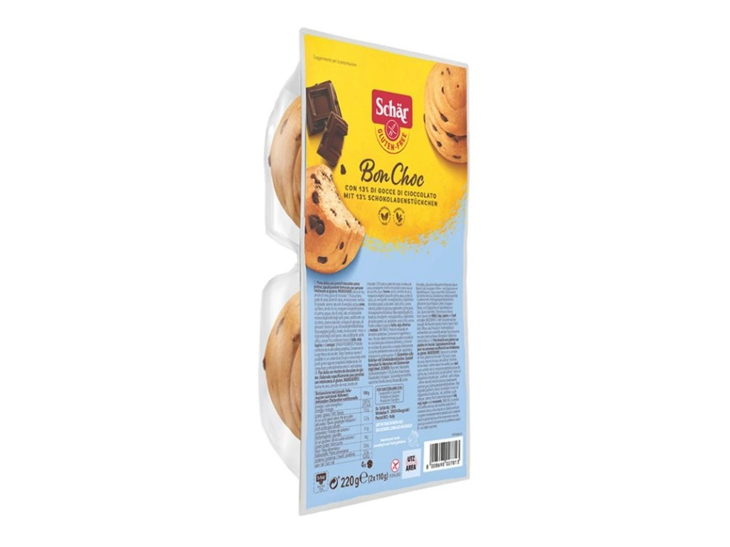 rýžová mouka, kukuřičný škrob, čokoládové kousky 13% (cukr, kakaová hmota, kakaové máslo, emulgátor: slunečnicový lecitin, přírodní vanilkové aroma), pitná voda, cukr, vejce, rýžový škrob, rostlinný margarín (palmový tuk, pitná voda, řepkový olej, jedlá sůl, emulgátory: mono- a diglyceridy mastných kyselin, kyselina citronová, přírodní aroma), glukozový sirup, zahušťovadlo: guma guar, hydroxypropylmethylcelulóza; rostlinná vláknina (psyllium), pekařské droždí, emulgátor mono- a diglyceridy mastných kyselin, jedlá sůl, kyselinya citrónová, aroma