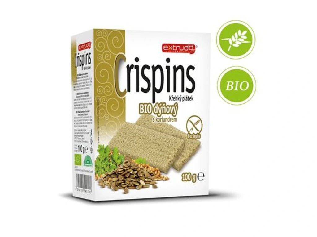 Křehký bezlepkový plátek Crispins Bio je extrudovaný křupavý chléb v biokvalitě s vysokým obsahem vlákniny a nízkým obsahem tuku a soli, obohacený o mouku z dýňových semínek.