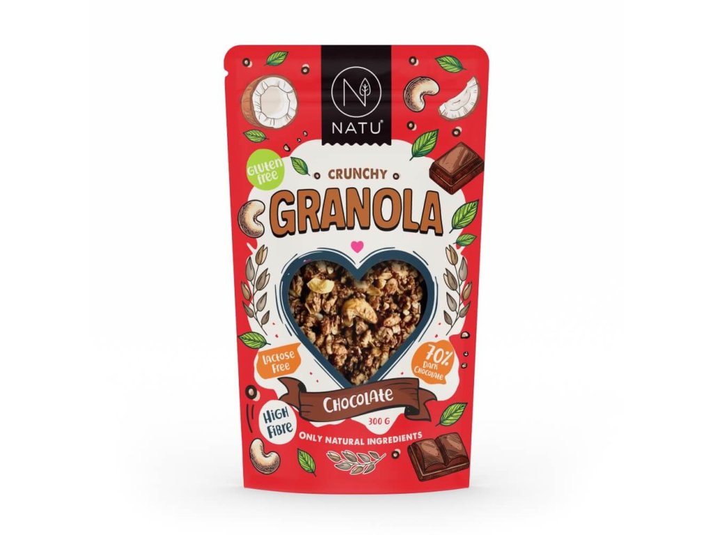 Granola Křupavá čokoláda povýší vaši snídani na nevšední zážitek. Pro maximální čerstvost pečeme granoly každý den ve vlastních pecích. Jak je již v NATU tradicí, při výrobě jsme se vyhnuli rafinovanému cukru, palmovému oleji i aromatům._x005F