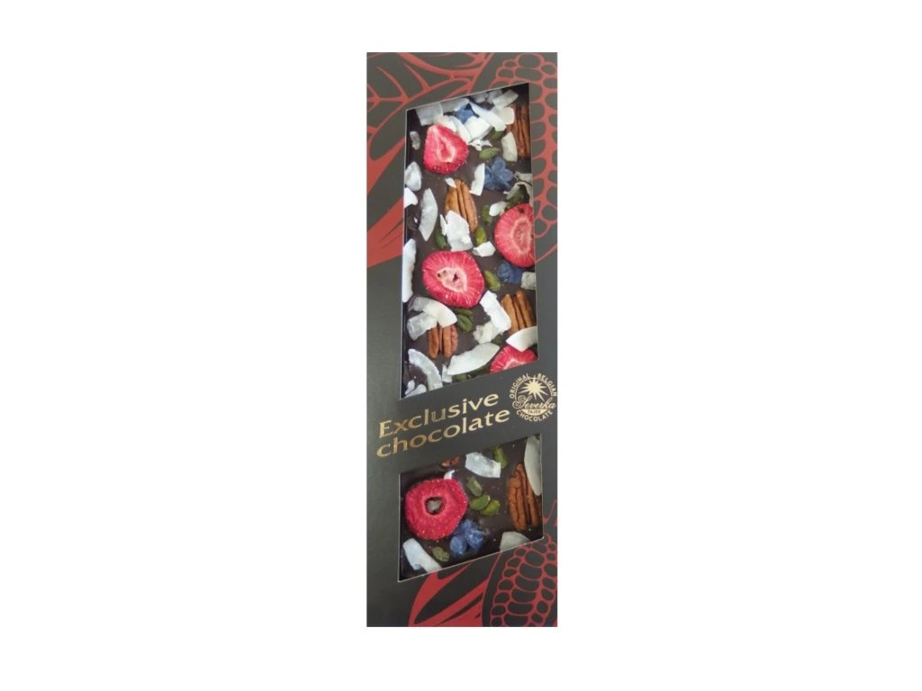 Bohatě zdobená belgická čokoláda je sypaná pekanovými ořechy, pistáciemi, jahodami, šeříkem a kokosem.