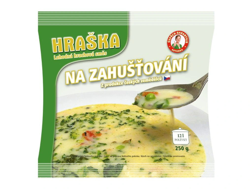 Polévky - polévkovou lžíci hrašky (cca 35 g) nasypeme do 1,5 litru vlažné polévky, zamícháme a 20 minut povaříme.