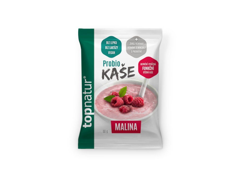 Bezlepková Probio kaše Malina je nutričně vyvážená funkční rýžová kaše s malinovou příchutí.