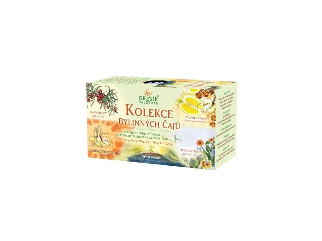 Kolekce obsahuje 5 druhů bylinných čajů: Rakytníkový, Zázvor & Citrón, Zahřívací se zázvorem, Životabudič a Sedmikvítek