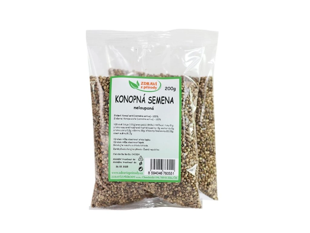 Konopné semínko neloupané je velmi oblíbené a velmi výživné semeno, které je vhodné k přímé konzumaci. Řadí se mezi superpotraviny. Obsahuje velké množství důležitých, zdraví prospěšných látek, a to 10 známých esenciálních aminokyselin, více než 80% esenciálních mastných kyselin, minerálů a celou řadu vitamínů, jako např. vitamín E, A, D, B1, B2, B6. Konopná semínka obsahují hořčík, železo, zinek, fosfor, vápník a vlákninu. Jsou bohatým zdrojem různých antioxidantů, včetně polyfenolů, flavonoidů a flavonolů. Konopná semínka nemají žádné psychotropní vlastnosti. Díky zachované slupce je neloupané konopné semínko křupavé a déle potrvá, než se rozkouše. Pro lepší stravitelnost lze semínka přes noc namočit nebo pomlet.