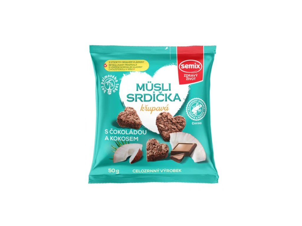 Rozkošně maličká cereální srdíčka s betaglukany. Müsli srdíčka pro vás vyrábíme unikátní technologií výroby. Jsou vhodné jako svačinka pro dospělé i děti. Mají vysoký obsah přirozené vlákniny (3,6 g v porci 50 g) a obsahují betaglukany, které přispívají k udržení normální hladiny cholesterolu v krvi. Pro dosažení požadovaného účinku je nutno přijmout 3 g betaglukanů denně. Nezapomínejte dodržovat základy zdravého životního stylu a konzumovat zdravou vyváženou stravu. Výrobek obsahuje 1,3 g betaglukanů v porci (50 g).