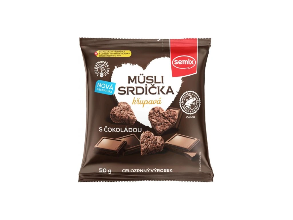 Srdíčka s čokoládou jsou směsí oslazených křupavých ovesných vloček, zpracovaných do tvaru srdíček Mají vysoký obsah přirozené vlákniny (3 g v porci 50 g) a obsahují betaglukany (1,1 g v porci 50 g). Betaglukany přispívají k udržení normální hladiny cholesterolu v krvi. Pro dosažení požadovaného účinku je nutno přijmout 3 g betaglukanů denně. Nezapomínejte dodržovat základy zdravého životního stylu a konzumovat zdravou vyváženou stravu.