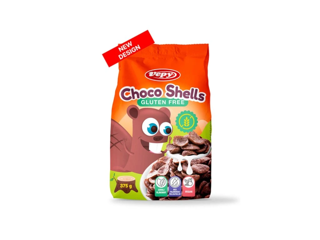 Naše nabídka bezlepkových obilných produktů značky Vepy obsahuje skořicové mušličky , kakaové mušličky , kakaové kuličky a kuličky slaný karamel.