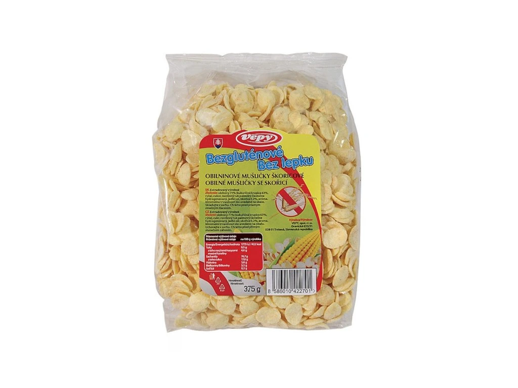 Obilné mušličky se skořicí jsou cereálie s kukuřično-rýžovým základem určené k přímé konzumaci. Kukuřice obecně je přirozeně bezlepkovou a nutričně velmi bohatou potravinou, má vysoký obsah vitamínů skupiny B, obsahuje rovněž minerální látky jako je železo, hořčík, zinek, mangan a selen. Rýže je bohatým zdrojem sacharidů s téměř nulovým obsahem tuků a obsahuje vitamíny skupiny B, minerály včetně železa, hořčíku, zinku a draslíku.