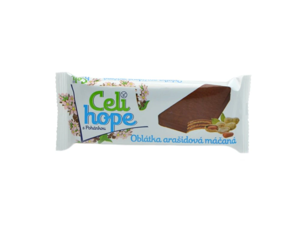 Arašídová oplatka Celihope je bezlepková oplatka s krémovou arašídovou náplní (48%) máčená v kakaové polevě. Oplatka obsahuje rutin a kyselinu listovou, je vhodná pro celiaky a je rychlým zdrojem energie při fyzické zátěži, sportovních výkonech, v práci nebo při cestování.