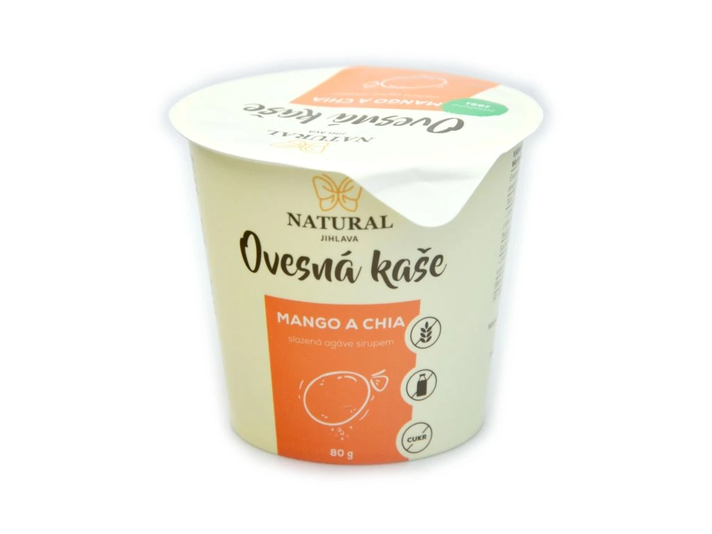 Jednoporcová bezlepková kaše v kelímku mango a chia, slazená RAW agáve sirupem. Návod na přípravu: Zalijte 180ml vroucí vody nebo mléka, ihned dobře promíchejte, nechte odstát 5 minut.