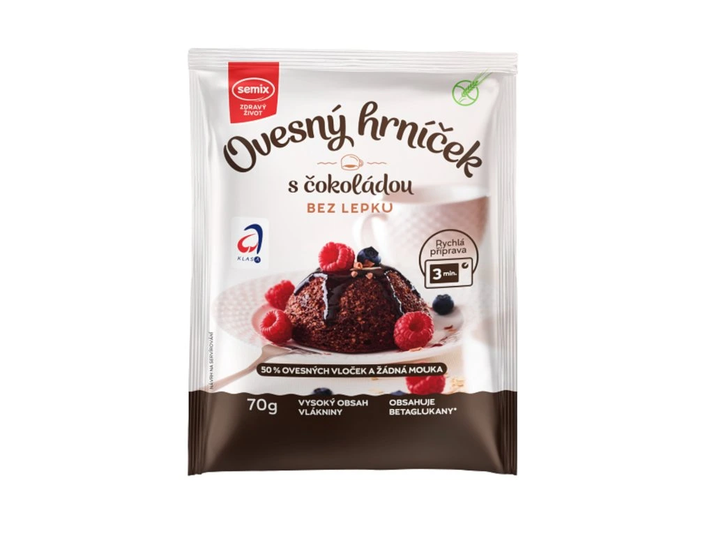 Sypká směs se smíchá se studenou vodou, nechá odstát a poté se upeče v mikrovlnné troubě. Zdravý dortík je hotov během cca 6 minut. Nejlépe chutná ještě teplý, ale lze si ho připravit i dopředu na výlet, do školy nebo do práce. Ovesný hrníček má vysoký obsah vlákniny, obsahuje betaglukany, které snižují hladinu cholesterolu v krvi. Je bezlepkový a bez palmového tuku. Návod k použití: Obsah sáčku vsypte do většího hrníčku (250 ml), zalijte asi 90 - 100 ml studené vody nebo mléka (9 polévkových lžic) a dobře promíchejte. Nechte 3 - 5 minut odstát, poté vložte do mikrovlnné trouby a nastavte příkon 700W a dobu 3 - 4 minuty, podle typu mikrovlnné trouby. Po ukončení pečícího programu můžete ihned konzumovat nebo po ukončení pečení můžete hrníček také otočit dnem vzhůru na talířek a vyklopit. Nakonec lze dochutit oblíbeným sirupem nebo medem, ovocem, zakysanou smetanou, oříšky, aj.