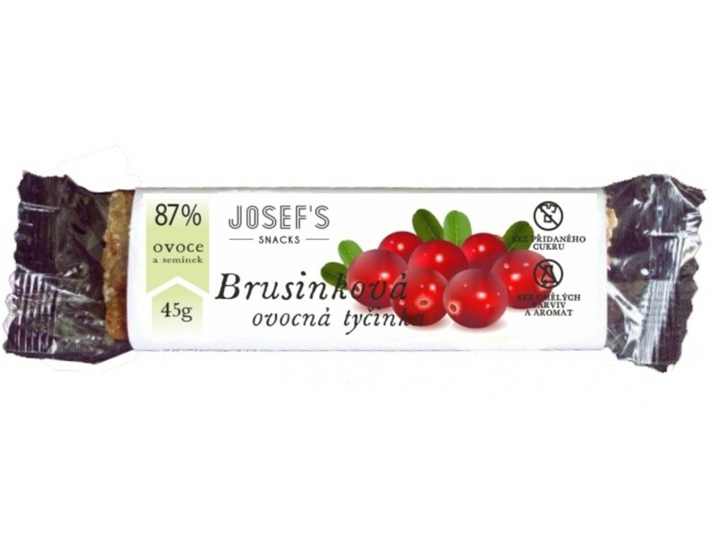 Josef's snacks Ovocná brusinková tyčinka 45 g Je výtečnou svačinou pro děti i dospělé. Složení: datlová pasta, Rawmazánka sluneční (slunečnicové semínko 84 %, slunečnicový olej, kakaové máslo), ovesné vločky, brusinky 15 % (brusinka, cukr), chia semínko 5 %, rýžový sirup bio. Ovocná brusinková tyčinka je výtečnou svačinou pro děti i dospělé.