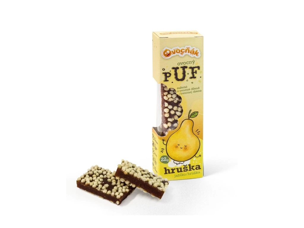 Ovocný puf je originální pochoutka vyrobená z ovocné dřeně zasypaná pufovanou (exrudovanou) rýží společně usušených za nízkých teplot. Pufy si zachovávají většinu výživných látek, které obsahuje čerstvé ovoce. Vrstva rýžových pufíků jim pak zajišťuje kromě křupavosti praktické použití snadné do ruky, protože nelepí. Obsahuje pouze přírodně se vyskytující cukry.