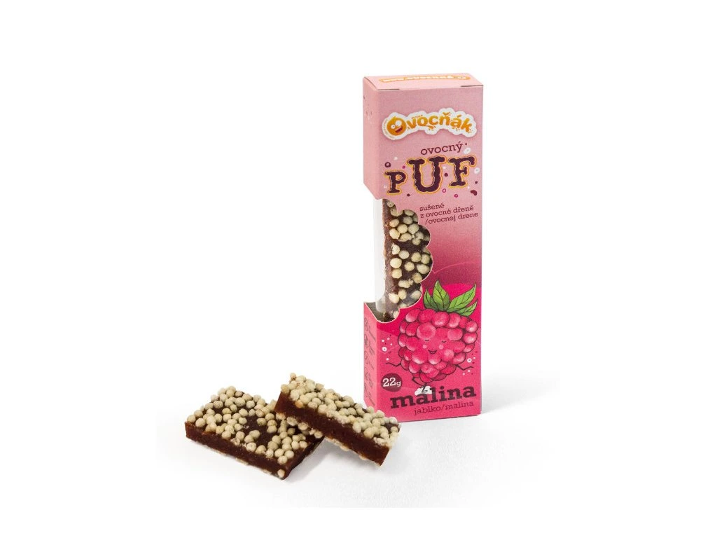 Ovocný puf je originální pochoutka vyrobená z ovocné dřeně zasypaná pufovanou (exrudovanou) rýží společně usušených za nízkých teplot. Pufy si zachovávají většinu výživných látek, které obsahuje čerstvé ovoce. Vrstva rýžových pufíků jim pak zajišťuje kromě křupavosti praktické použití snadné do ruky, protože nelepí. Obsahuje pouze přírodně se vyskytující cukry.
