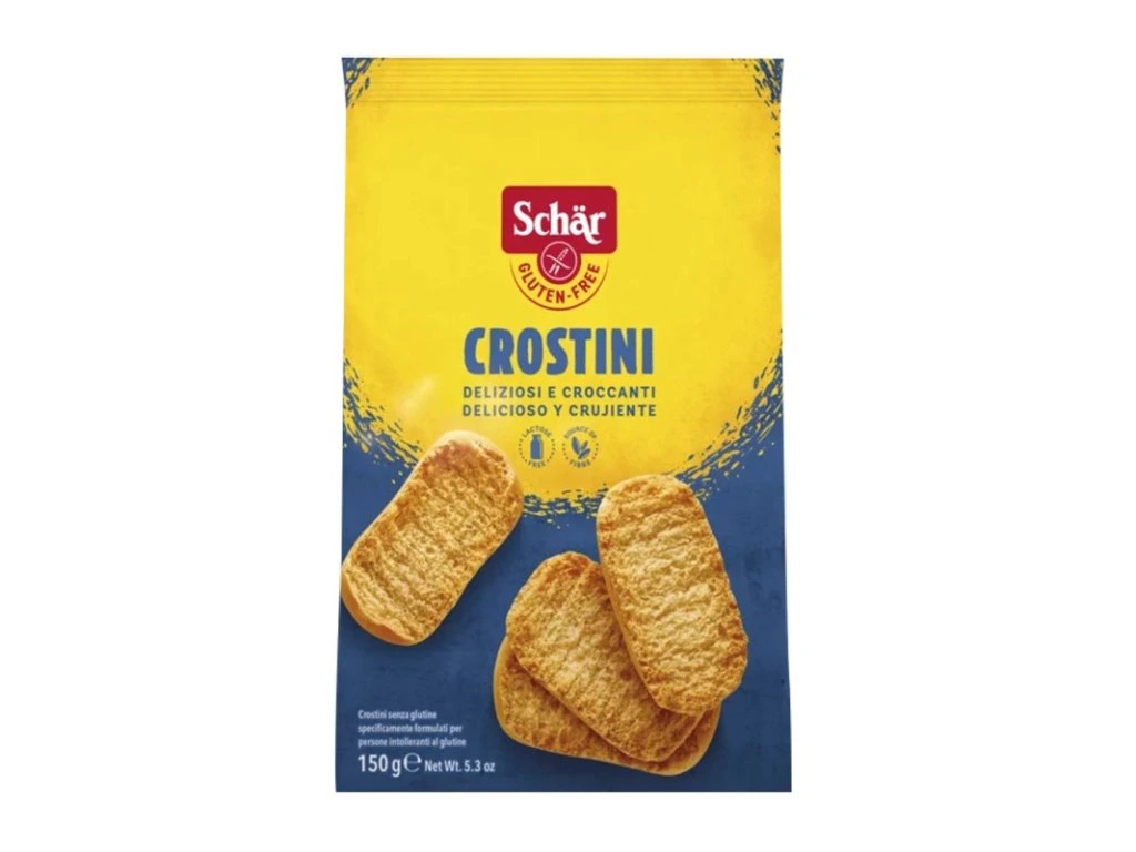 Suché bezlepkové suchary Crostini jsou suché křupavé chlebíky určené k přímé konzumaci, mají dlouhou trvanlivost, a jsou vhodné k rychlému občertvení. Balení obsahuje 15 sucharů.