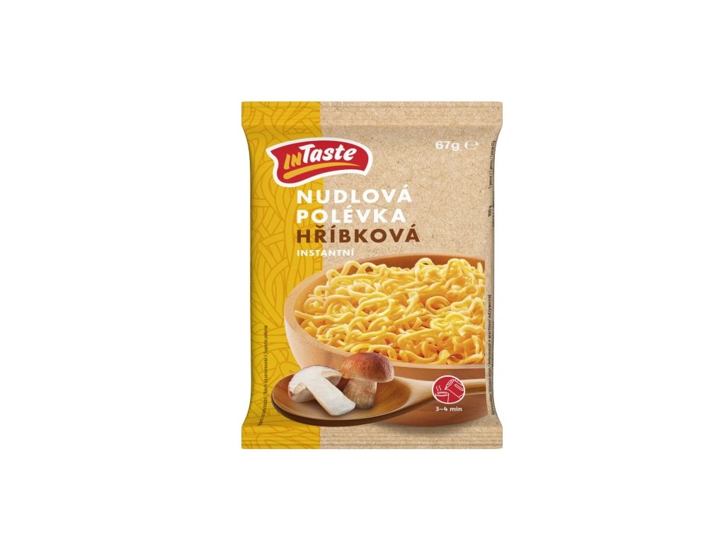 Instantní bezvaječné nudle 82,1%, PŠENIČNÁ mouka, palmový tuk (P) nebo slunečnicový olej (S)*, jedlá sůl, cukr, regulátory kyselosti (uhličitany sodné, uhličitany draselné), zahušťovadlo (guma guar). Sypký kořenící přípravek 17,9% - jedlá sůl, mouka PŠENIČNÁ instatní, sušený tuk palmový (palmový tuk, glukózový sirup z PŠENICE, MLÉČNÁ bílkovina), sušené odstředěné MLÉKO, bílkovinný SÓJOVÝ hydrolyzát, sušená zelenina 8,2% (cibule, česnek, karotka, petržel.nať), cukr, LAKTÓZA, škrob bramborový, směs hřibovitých hub 1,8% (0,5% hřib hnědý, klouzek obecný, křemenáč osikový, kozák březový), aromata (obsahující CELER), směs koření, barvivo: amoniak-sulfitový karamel. *V závislosti na použité surovině: viz potisk na boční straně obalu slunečnicový olej (S) nebo palmový tuk (P).