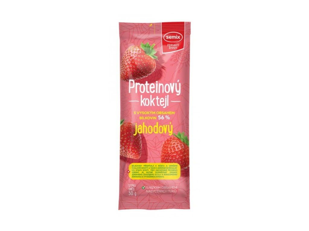 Proteinový koktejl je osvěžující nápoj s vysokým obsahem bílkovin, který pomůže vašim svalům regenerovat. Ideální je tedy konzumovat jej během nebo po sportovním výkonu. Je nicméně vhodný i ke konzumaci mimo sport, jako doplnění bílkovin. Sáček obsahuje 17 g bílkovin = kvalitního syrovátkového proteinového koncentrátu. Má nízký obsah nasycených mastných kyselin. Koktejl obsahuje 5 % sušených jahod. Návod k použití: Obsah sáčku zalijte 300 ml vody nebo mléka, důkladně promíchejte nebo rozmixujte.