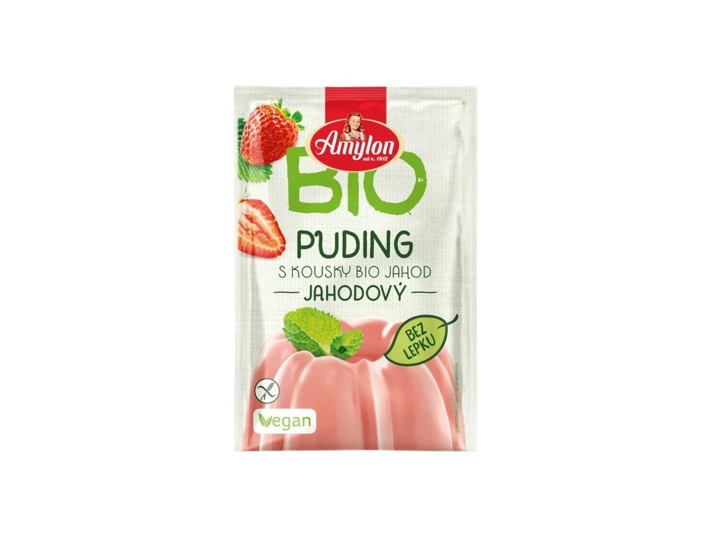 Bezlepkový jahodový puding v bio kvalitě je lahodný puding s kousky sušených BIO jahod, který je připraven pouze z BIO surovin. Veškeré přísady jsou ryze přírodního původu, puding je bez přidaného cukru a sladidel. Pokud není při přípravě pudingu použit cukr, je vhodný také pro diabetiky. Zaměníme-li mléko za rostlinný nápoj (ovesný, kokosový, sojový nebo mandlový), získáme bezlaktózovou verzi pudingu.