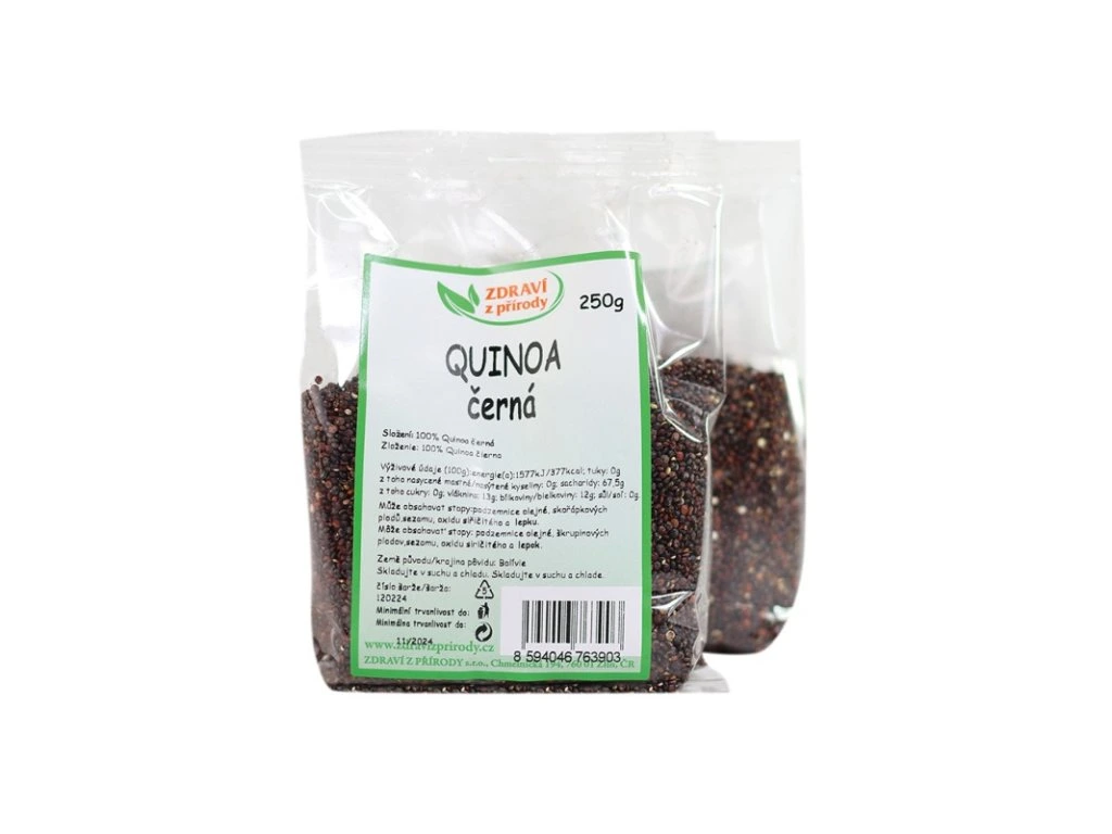 Quinoa černá je bezlepková pseudoobilovina s vysokým podílem bílkovin, které mají velmi příznivou skladbu aminokyselin. Quinoa má vysoký obsah vlákniny a nízký glykemický index. Hlavní složkou quinoy je škrob, bílkoviny, cukry a menší množství zejména nenasycených mastných kyselin. Quinoa je bohatá na vitamíny B1, B2, C, E, kyselinu listovou, betakaroten a antioxidanty, obsahuje vápník, fosfor, draslík, hořčík, mangan, měď i zinek.