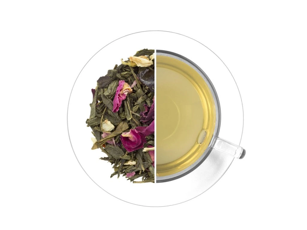 Pravý zelený čaj Sencha a China Jasmin s květy, obohacený o šťavnatou chuť zralých třešní a jemný jasmínový nádech. Harmonická kombinace vytváří elegantní čaj s lehce nasládlou, ovocnou vůní a příjemně svěží chutí, ve které se prolínají květinové tóny jasmínu s jemnou sladkostí třešní.