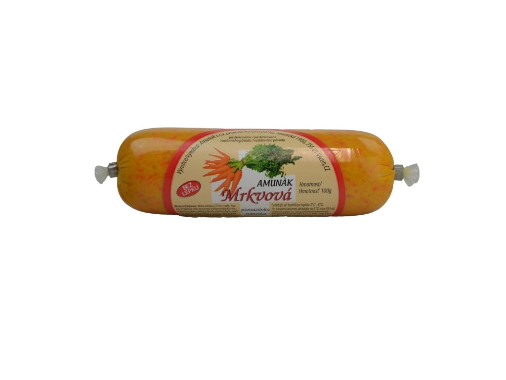 Mrkev (73%), voda, řepkový olej, hrachová bílkovina, bramborový škrob, cibule, ocet, HOŘČIČNÉ semeno, rajčatový prášek, mořská sůl, SÓJOVÁ bílkovina, zahušťovadlo: guma Euchema, guma guar, xanthan, koření, cukr, barvivo: betakaroten