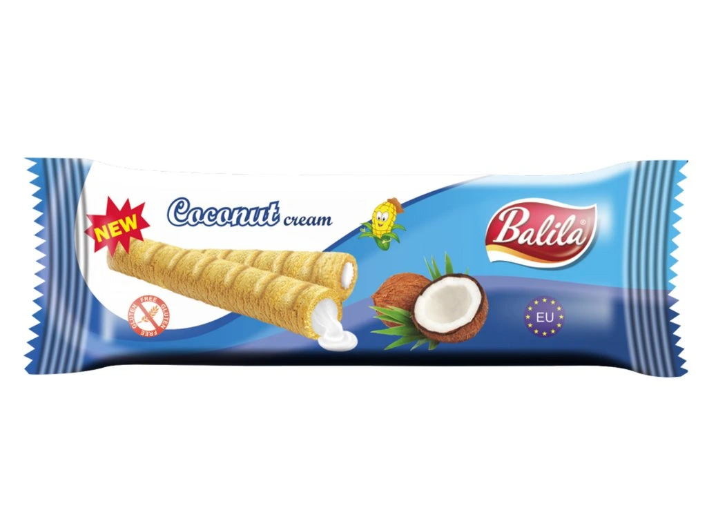 Kukuřičné trubičky plněné krémem s kokosovou příchutí (83%). Trvanlivé pečivo. Extrudovaný výrobek ochucený. Bez lepku.
