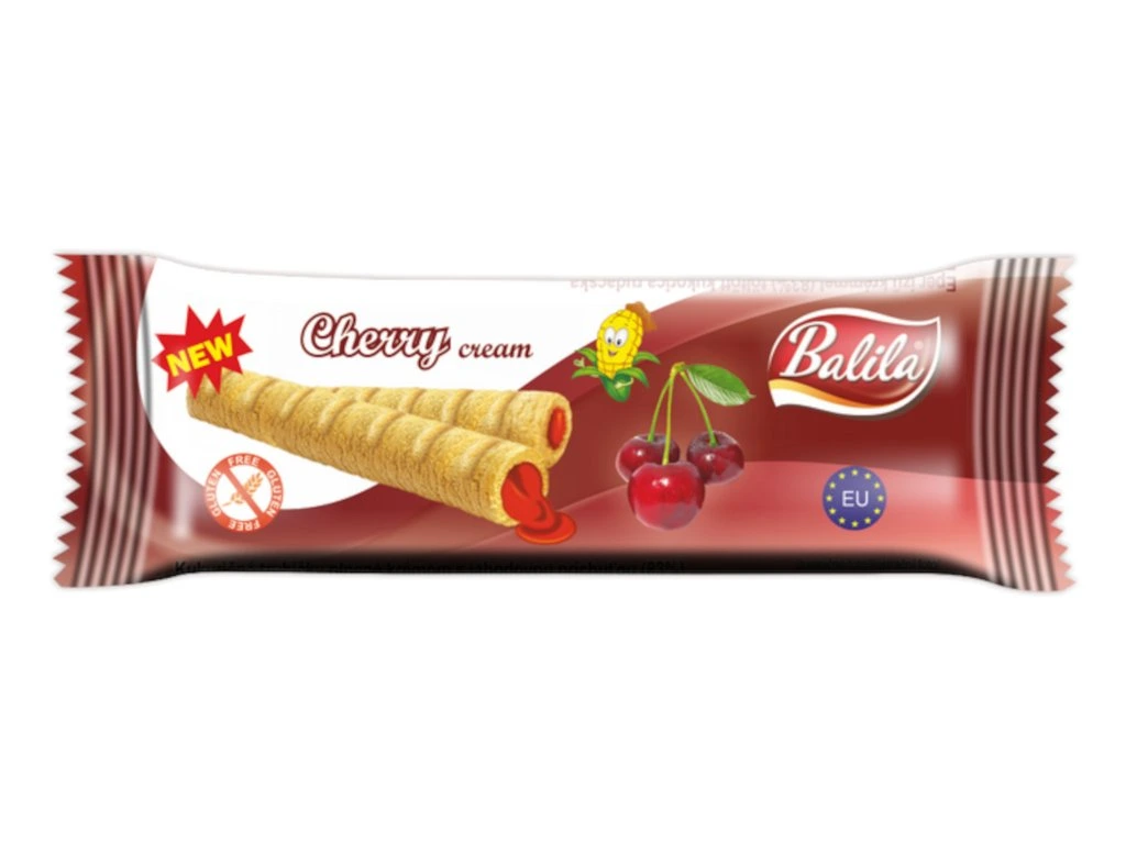 Kukuřičné trubičky plněné krémem s třešňovou příchutí. Trvanlivé pečivo. Extrudovaný výrobek ochucený. Bez lepku.