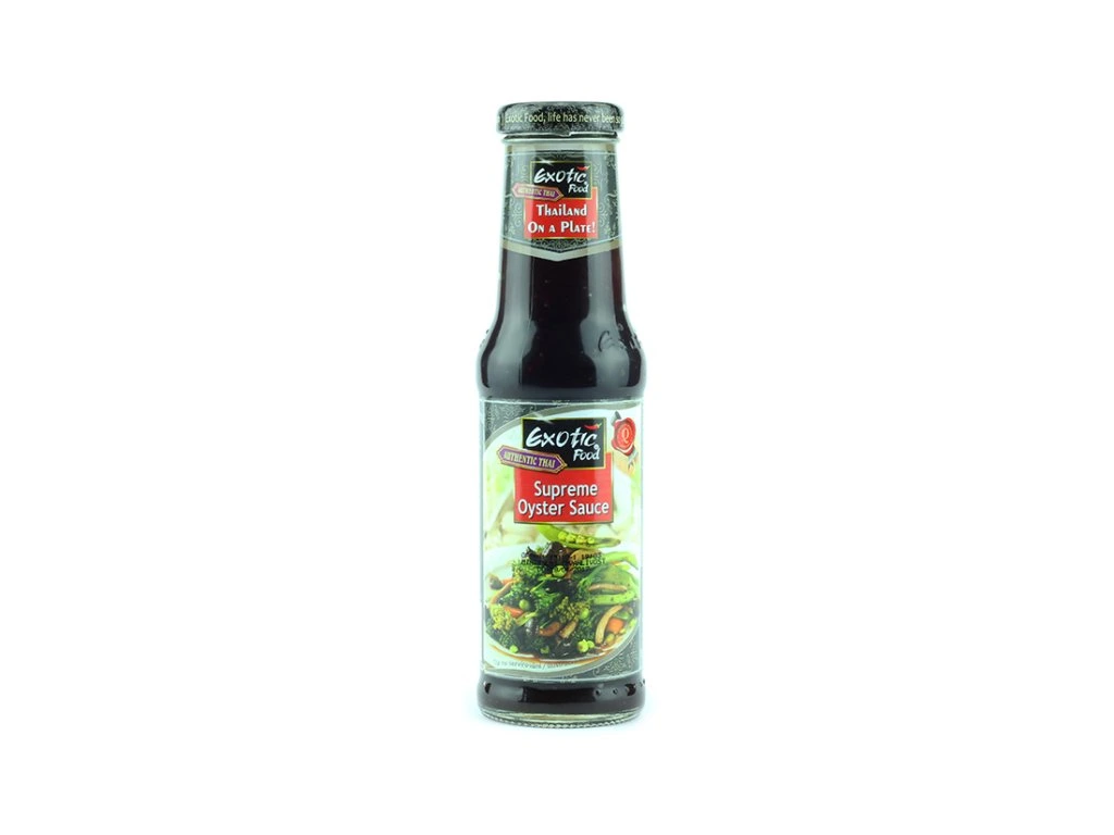 pitná voda, cukr, jedlá sůl, SOJOVÁ omáčka 6%(fermentované mleté SOJOVÉ boby 62 % hm, PŠENIČNÁ mouka, voda,jedlá sůl,cukr), modifikovaný tapiokový škrob, ÚSTŘICOVÉ aroma 1,85 %, barvivo: karamel E 150a, zahušťovadlo: xanthan E 415, ochucující směs s hovězím aroma: (sojové boby, pitná voda, maltodextrin, jedlá sůl, aroma hovězího masa ), konzervant: sorban draselný E 202