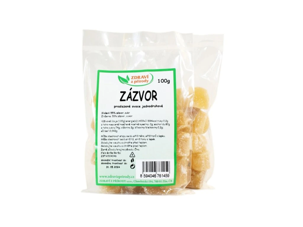 Zázvor je sušený proslazený oddenek zázvoru. Je výbornou variantou originálního rychlého občerstvení, pro rychlé a praktické zahřátí, při pohoštění, chuti na něco výjimečného nebo ve studené kuchyni pro přípravu a dekoraci dezertů. Spojení sladké a štiplavé chuti dokáže osvěžit a příjemně a přirozeně zahřát.