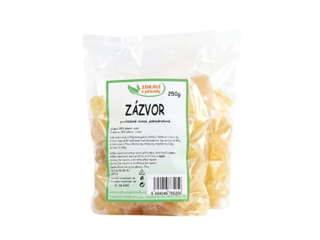 Zázvor je sušený proslazený oddenek zázvoru. Je výbornou variantou originálního rychlého občerstvení, pro rychlé a praktické zahřátí, při pohoštění, chuti na něco výjimečného nebo ve studené kuchyni pro přípravu a dekoraci dezertů. Spojení sladké a štiplavé chuti dokáže osvěžit a příjemně a přirozeně zahřát.